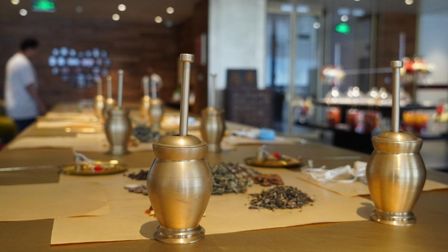 制作香囊需要的中草药以及工具。新华网记者 李晏摄
