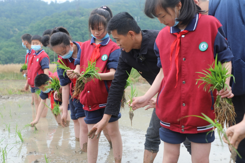 2022年5月20日,学生在河东乡后田村袁家山科普教育基地体验禾苗播种。新华网发 余文明 摄