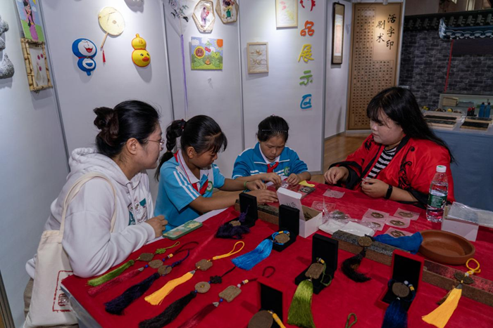 9月26日,在天津市传统文化研学基地,志愿者正在介绍传统香牌制作技艺。新华网 钟奕 摄