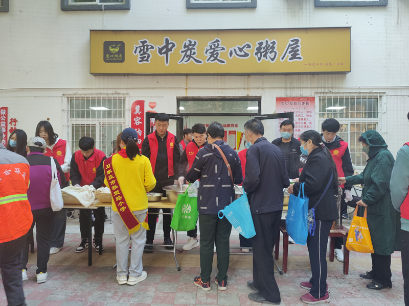 10月14日,在“雪中炭爱心粥屋”前,志愿者在发放早餐。新华网 李然 摄