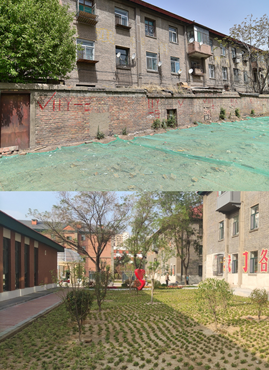 青山区自由路二号街坊老旧小区改造前后对比图。上图为楼宇改造前,下图为改造后。(包头市委宣传部供图)