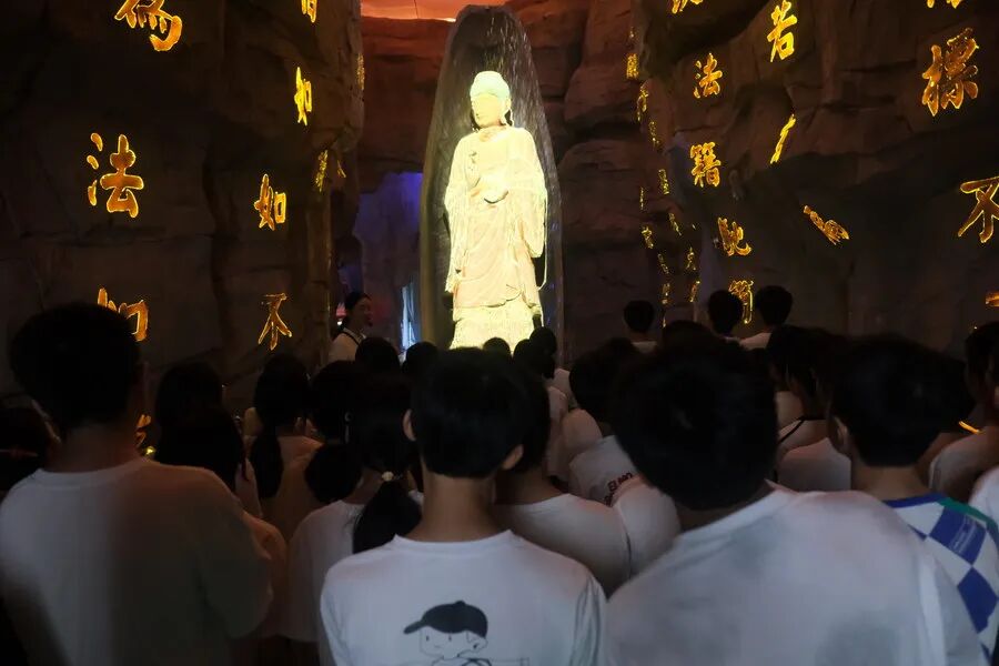 学生们在安岳石窟数字展示中心Boxfilm沉浸式影院观看石窟开凿雕刻过程。四川文明网供图
