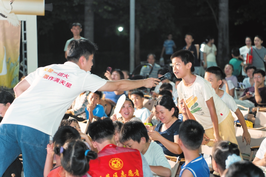 今年暑假,在秀英区五源河公寓小区,“小英带你看电影”活动以“电影+宣讲”的形式为观众带来一堂“文明实践课”。图为活动现场,小朋友积极参与问答互动。石中华 陈创淼 摄