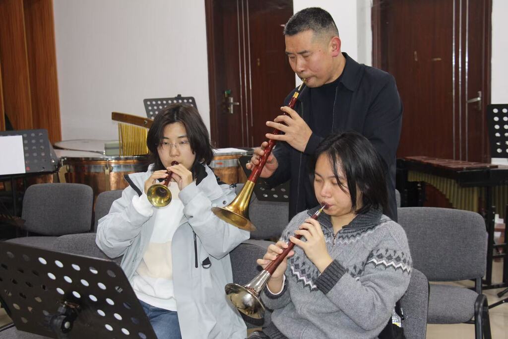 小河锣鼓传统教学中,“切切打噔噔噔”等复杂节奏难以精准传递,工作坊团队创新采用现代记谱法,将鼓、锣、钹等声部分解标注,结合五线谱教学,大幅降低学习门槛。学员们还主动尝试“传统+现代”融合:电吹管学员以便捷创新的乐器为锣鼓注入新声,唢呐组从“吹不响”到肺活量显著提升,鼓类组更立下“站上更大舞台”的目标。下一步,工作坊将聚焦“速度提升”与“动态表演”,要求学员背谱演奏并融入情感表达,让传统乐种更具感染力。