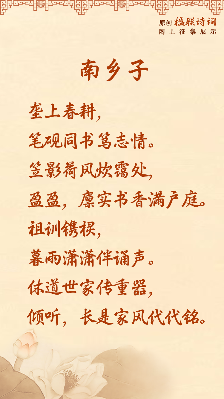 以诗会友,以联传情!中国精神文明网和中国楹联学会共同策划开展原创楹联诗词网上征集展示活动,让我们共赏楹联诗词,弘扬中华民族传统美德,共建家庭文明良好风尚。