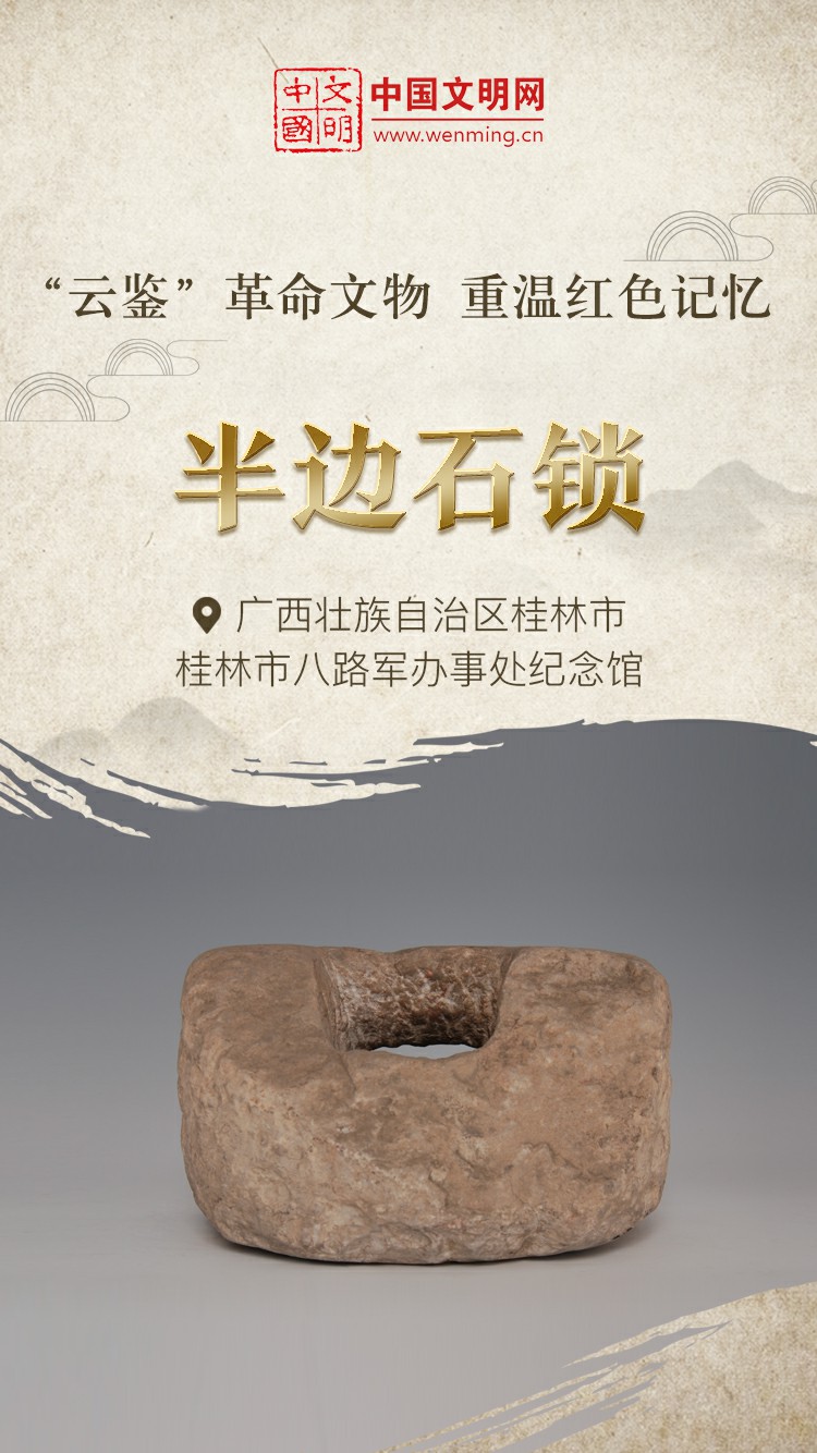 革命文物,承载党和人民英勇奋斗的光荣历史,是弘扬革命传统和革命文化、加强社会主义精神文明建设、激发爱国热情、振奋民族精神的生动教材。中国文明网“文明之声·云鉴馆藏”专栏邀您走进各地革命博物馆、纪念馆、党史馆、展览馆等展馆,一起“云鉴”红色馆藏,汲取奋进力量。今天为您介绍桂林市八路军办事处纪念馆的馆藏文物——半边石锁。